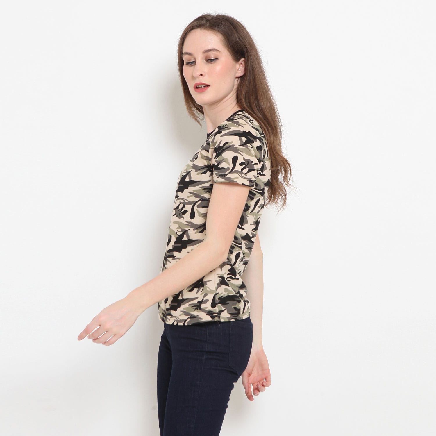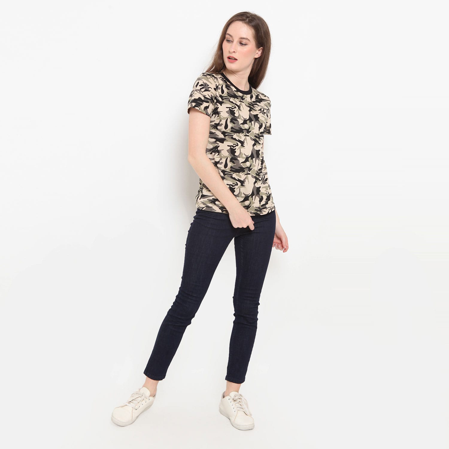 Kaos wanita kekinian dengan desain slim fit lengan pendek yang sangat trendi untuk aktifitas bersantai. Terbuat dari bahan baby terry dengan kerah bulat dan memiliki detail camo dengan rib. Tersedia pilihan motif light camo dan dark camo.