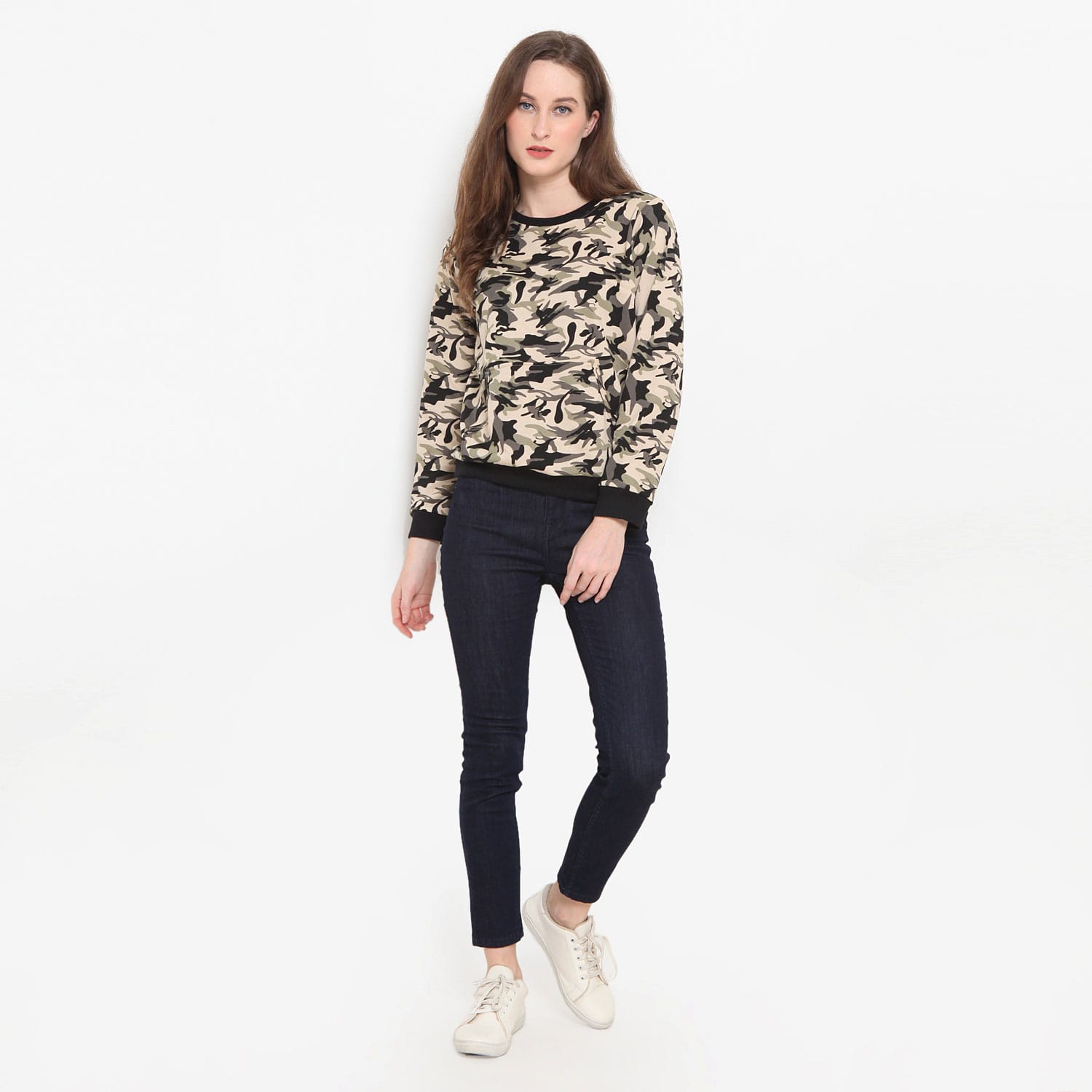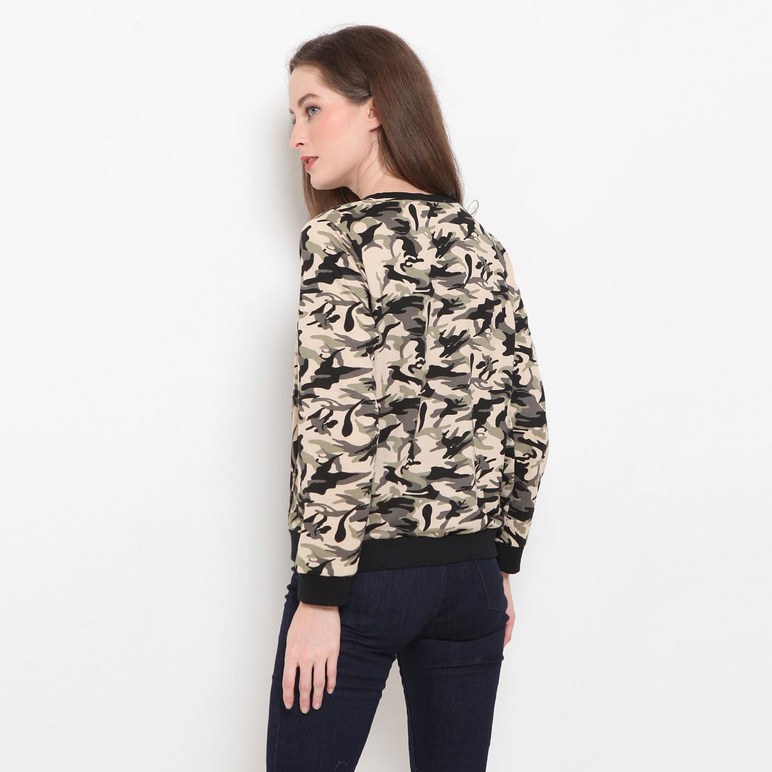 Kaos wanita kekinian dengan desain relaxed fit lengan panjang yang sangat trendi untuk aktifitas bersantai. Terbuat dari bahan baby terry dengan kerah bulat dan memiliki camo dengan rib. Tersedia pilihan motif light camo dan dark camo.